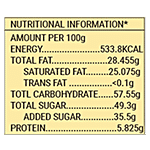 Nutrition per gram/ml: 100g Energy: 533.8kcal Total Fat: 28.455g Saturated Fat: 25.075g Trans Fat: <0.1g Total Carbohydrate: 57.55g Total Sugar: 49.3g Added Sugar: 35.5g Protein: 5.825g