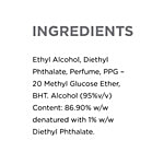 Ethanol, Diethyl Phthalate, Perfume, PPG – 20 Methyl Glucose Ether, BHT. Alcohol (95%V/V) Content: 86.90% W/W Denatured With 1% W/W Diethyl Phthalate.