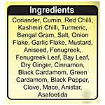 Coriander, Cumin, Red Chilli, Kashmiri Chilli, Turmeric, Bengal Gram, Salt, Onion Flake, Garlic Flake, Mustard, Sugar, Aniseed, Fenugreek Leaf, Bay Leaf, Dry Ginger, Cinnamon, Black Cardamom, Green Cardamom, Green Cardamom, Black Pepper, Clove, Mace, Anistar & Asafoetida.