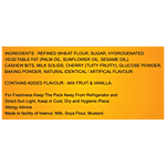 Refined Wheat Flour, Sugar, Hydrogenated Vegetable Fat (Palm Oil, Sunflower Oil, Sesame Oil), Cashew Bits, Milk Solids, Cherry (Tuity Fruity), Glucose Powder, Baking Powder, Natural Identical/Artificial Flavour. Contains Added Flavour - Mixed Fruit & Vanilla.