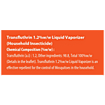 Chemical Composition: Transfluthrin (A.I): 1.2, Other Ingredients: 98.8, Total 100%W/W (Details In Leaflet). Transfluthrin 1.2%W/W Liquid Vaporiser.