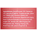 Ingredients: Sunflower Oil, Sesame Oil, Caprylic/Capric Triglyceride. Olive Oil. Castor Oil, Onion Seed Oil, Almond Oil, Ocimum Basilicum Hairy Root Culture Extract & Coconut Oil, Argan Oil, Amla Oil, Bhringraj Oil, Fenugreek Oil, Ylang Ylang Oil, Rosemary Oil, and Vitamin E.