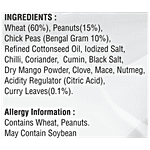 Wheat (6%), Peanuts (15%), Chickpeas (Bengal Gram 1%), Refined Cottonseed Oil, Iodised Salt, Black Salt, Chilli, Cumin, Coriander, Dry Mango Powder, Clove, Mace, Nutmeg, Acidity Regulator (Citric Acid), Curry Leaves (.1%)