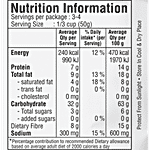 Nutrition per gram/ml: 100g Serving Size: 50g Energy: 470 kcal Protein: 14 g Total fat: 18 g saturated fat: 8 g trans fat: 0 g Carbohydrate: 63 g Total sugars: 6 g added sugars: 0 g Dietary Fibre: 15 g Sodium: 600 mg