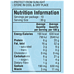 Nutrition per gram/ml: 100g Serving Size: 30 g Energy/Calories: 630 kcal Protein: 20 g Fat, total: 52 g Fat, saturated: 9 g Fat, trans: 0 g Cholesterol: 0 mg Carbohydrate: 21 g Carbohydrate, sugars: 4 g Dietary Fibre: 4 g Sodium: 630 mg Niacin: 11 mg