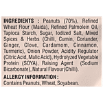 Peanut (70%), Refined Wheat Flour(Maida), Refind Palmolein Oil, Tapioca Starch, Sugar, Iodised Salt, Mixed Spices & Herbs (Chilli, Cumin, Coriander, Ginger, Clove, Cardamon, Cinnamon, Turmeric), Onion Powder, Acidity Regulator(Citric Acid,malic Acid), Hydrolyzed Vegetable Protein (Soya), Raising Agent (Sodium Bicarbonate), Natural Flavour(Chilli)