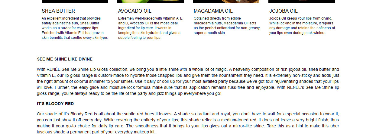 See Me Shine Like Divine with Renée See Me Shine Lip Gloss collection, we bring you a little shine with a whole lot of magic. A heavenly composition of rich jojoba oil, shea butter and Vitamin E, our lip gloss range is custom-made to hydrate those chapped lips and give them the nourishment they need. It is extremely non-sticky and adds just the right amount of colourful shimmer to your smiles. Use it daily or doll up for your most awaited party because we’ve got eight rejuvenating shades that your lips will love. Further, the easy-glide and moisture-lock formula make sure that its application remains fuss-free and enjoyable. With Renée’s See Me Shine lip gloss range, you’re always ready to be the life of the party and jazz things up everywhere you go!
