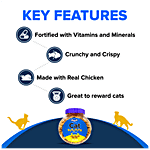 Drools Cat Biscuit is made of excellent quality ingredients such as real chicken, egg, rice flour and wheat flour. Each biscuit offers complete nutrition with no added artificial flavours and colours. The cat biscuits are crunchy and crispy and can be used as treats for your cat whenever you want to reward them. It helps in slowing down the tartar buildup, the optimal proportion of omega 3 and 6 fatty acids helps the cats to maintain a healthy and lustrous coat.