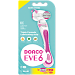 Dorco Eve 6 Razor System. 1 Handle with 2 Cartridges. Triple formula lubricating strip with Vitamin E, Aloe Vera and Argan Oil. 6 MicroSpan blades for a smooth shave.