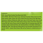 Pasta: Durum Wheat Semolina Pasta (Rawa/Suji) (1%), Sauce Maker: Milk Powder, Refined Sugar, Dehydrated Vegetables [(Garlic, Sweet Corn (4%), Potato Powder)], Edible Common Salt, Cheese Powder (Processed Cheese (8.5%), Milk Powder, Maltodextrin, Stabilizer), Maltodextrin, Edible Starch, Spices (4.3%) (Garlic Powder, Onion Powder, White Pepper), Herbs [Spring Onion (.9%), Parsley, Oregano, Chives], Yeast Extract Potassium Chloride (INS 58), Flavour Enhancer (INS 635), Stabilizer (INS 415), Anticaking Agent (INS 551)