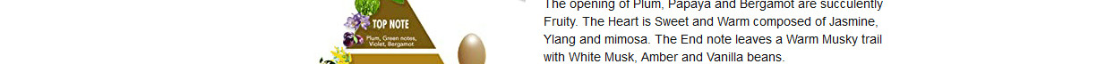 This independent fragrance is sweet with a touch of spice. The opening of Plum, Papaya and Bergamot are succulently fruity. The heart is sweet and warm composed of Jasmine, Ylang and Mimosa. The endnote leaves a warm Musky trail with White Musk, Amber and Vanilla Beans. A fresh Lavender and Bergamot note blend with Ozonic Basil & Mint fragrance on top. The floral hearts of Coriander, Cinnamon and Carnation Jasmine are supported by the warm bottom of Leatheriest Oakmoss, Patchouli and Sandalwood.