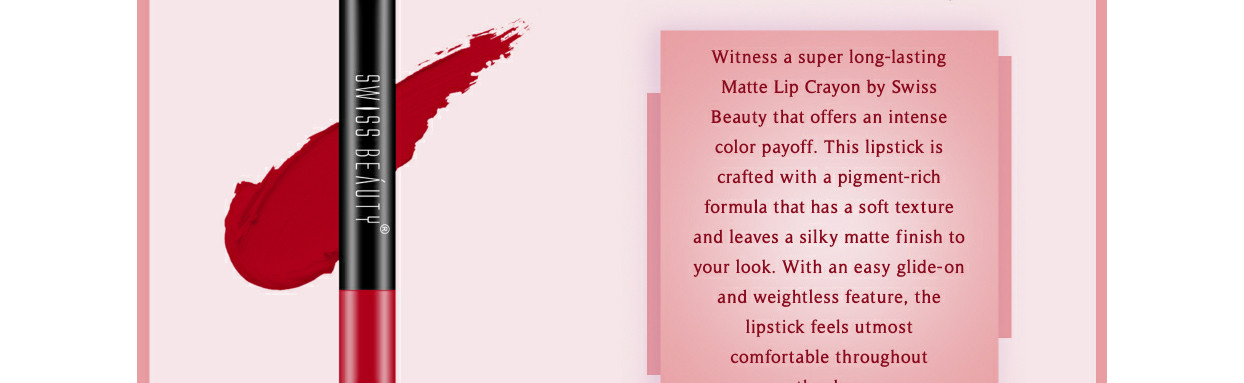 Swiss Beauty Non-Transfer Matte Crayon Lipstick 3.5 g Artist Nudeis a long-lasting, smudge-proof lip crayon with an extreme matte finish. It is enriched with beeswax to keep the lips hydrated and nourished, while providing a weightless, feathery-soft feel. The lip crayon is waterproof and sweatproof, ensuring the colour does not fade. It is available in 24 shades, ranging from natural nudes to bold hues, specially curated for Indian skin tones.