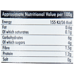 Nutrition per gram/ml: 100g Energy: 155 KJ/36 Kcal Fat: 0.6g Of which saturates: 0.1g Carbohydrates: 6g Of which sugars: 4g Fibre: 1.5g Protein: 1.2g Salt: 0g