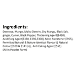 Sugar, Dextrose, Mango, Malto Dextrin, Dry Mango, Black Salt, Ginger, Cumin, Black Pepper, Thickening Agent(E468), Acidifying Agent(E330,E296,E300), Mint, Sweetener(E955), Permitted Natural & Nature Identical Flavour & Natural Colour(E100 & E141(Ii)), Anti Caking Agent(E551). (All In Powder Form)