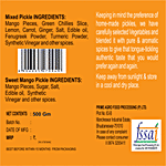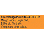 Sweet Mango Pickle - Mango Pieces, Sugar, Salt, Edible Oil, Synthetic Vinegar and Other spices.
