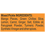 Mixed Pickle- Mango Pieces, Green Chillies Slice, Lemon, Carrot, Ginger, Salt, Edible Oil, Fenugreek Powder, Turmeric Powder, Synthetic Vinegar and other Spices.
