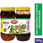 Prime Mixed Pickle is hygienically processed from the best quality fruits and vegetables. This traditional style pickle is a spicy and tasty complement to any meal. It contains ingredients like mango, carrots, lime, vinegar and other spices. It is tangy, spicy and a little bit sweet. It contains several essential vitamins like Vitamin C, Vitamin A and Vitamin K, and minerals like iron, calcium, and potassium. Enjoy this flavourful mix of pickles with every meal. Prime Sweet Mango Pickle is hygienically processed from the best quality mangoes. This traditional style pickle is a sweet and tasty complement to any meal. Its sour and sweet taste titillates the taste buds. This mouth-watering pickle is made from raw mangoes, mixed with other spices and ingredients. It has natural antioxidants, improving digestive health, providing vitamin C, and helping in generating healthy gut-flora.