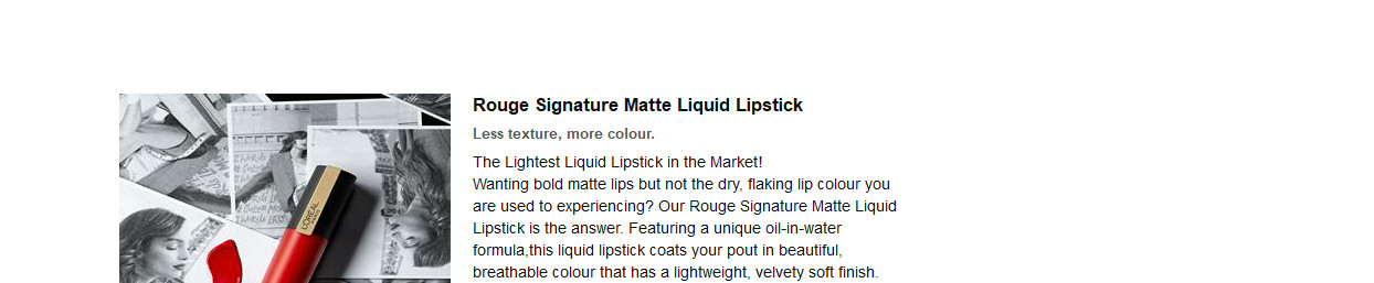 Find your perfect shade of nudes with Rouge Signature! This lightweight matte coloured ink delivers a stain-like feel with the colour impact of a liquid lipstick. Imparts lips with a high pigment, matte finish, and lasting wear. Less texture, more colour: Rouge Signature is a lightweight matte coloured ink that delivers intense pigment loads with a weightless, bare-lip sensation. This ultra-comfortable liquid matte coloured ink provides lasting matte colour and infuses lips with a healthy, even dye of colour. The no-makeup feel of a stain combined with the colour impact of a liquid lipstick. Find your signature shade from our captivating range.