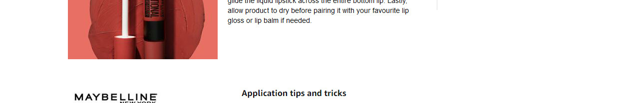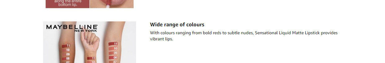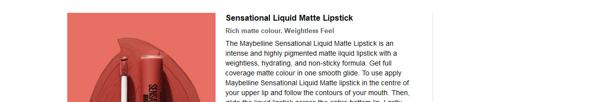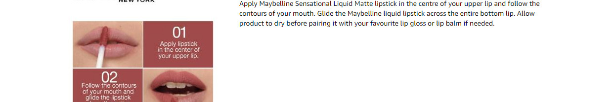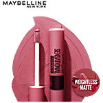 The Maybelline New York Sensational Liquid Matte Lipstick is an intense and highly pigmented liquid matte lipstick with a weightless, non-drying and non-sticky formula. Get long-lasting lipstick that also gives full coverage matte colour in one smooth glide. Get intense matte lips that wow with Color Sensational Liquid Matte lipstick. The liquid lipstick delivers rich matte colour in a lightweight feeling. This moisturizing matte liquid lipstick is infused with an anti-shine coating for the ultra-matte look and a powder light texture to saturate your lips in one stroke colour impact. So light and matte comfort texture, that moves with you like not wearing lipstick at all. Maybelline Sensational liquid matte lipstick is a non-sticky, noncracking and non-drying formula. It is available in 20 rich colour lipstick shades, from Nudes, Pinks to classic Reds, the perfect shades to suit and flatter all skin tones, in an edgy and modern pack design.