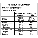 Nutrition per gram/ml: 100g Serving Size: 40g Energy: 1764 kJ (420 kcal) Protein: 2.4 g Fat, total: 14.0 g Saturated Fat: 6.0 g Carbohydrate: 71 g Sugars: 60 g Sodium: 0 mg