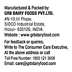 Manufactured & Marketed By: GRB dairy foods Pvt ltd # No : 10,Phase III,Sidco Industrial Estate, Hosur - 635126 , India.