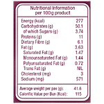 Nutrition per gram/ml: 100g Energy (kcal): 277 Carbohydrates (g): 50.1 of which Sugars (g): 3.74 Proteins (g): 11 Dietary Fibre (g): 6.1 Fat (g): 3.63 Saturated Fat (g): 1.47 Monounsaturated Fat (g): 1.44 Polyunsaturated Fat (g): 0.72 Trans Fat (g): NIL Cholesterol (mg): 3 Sodium (mg): 571
