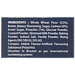 Whole Wheat Flour (52%), Butter, Bakery Shortening, Sugar, Cashew(6%), Invert Sugar, Pistachio (1%), Glucose Powder, Custard Powder, Skimmed Milk Powder, Baking Powder, Iodised Salt, Vanilla Powder, Rising Agents [INS 500(ii) and 503(ii)] Contains Added Artifical Flavouring- Artificial Flavouring Substance (Pistachio)