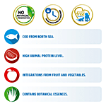 Cod (28%), Dehydrated Cod Protein (27%), Sweet Potato, Fish Oil (From Herring), Dehydrated Herring Protein, Dried Pumpkin (5%), Dehydrated Shrimp (Source Of Glucosamine And Chondroitin Sulphate), Pea Fibre, Dried Carrot, Alfalfa Meal, Inulin, Fructo-Oligosaccharides, Yeast Extract (Source Of Manno-Oligosaccharides), Dried Cantaloupe Melon (0.5%), Dried Apple, Dried Pomegranate, Dried Spinach, Psyllium Husks And Seeds, Dried Blueberry, Sodium Chloride, Potassium Chloride, Calcium Carbonate, Dried Brewers’ Yeast, Turmeric (0.2%), Aloe Vera Extract.