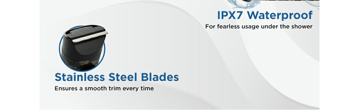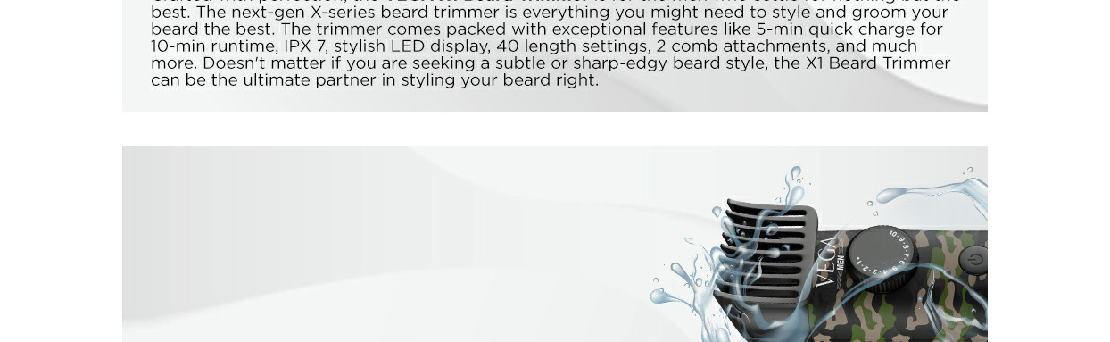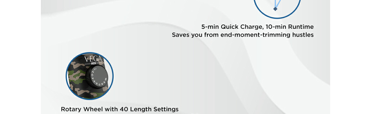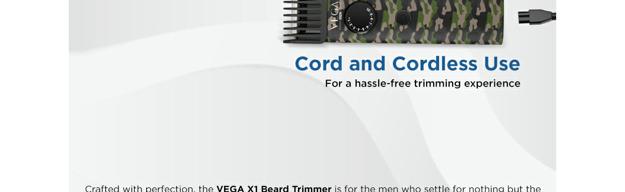VEGA Beard Trimmers are crafted with perfection for the man who settles for nothing but the best. The next-gen X series trimmer comes with a designer print in two unique colours, the army print and the cool chequered print. With the 5-minute quick charge feature, you can use the trimmer for up to 10 minutes with ease when in a hurry. The revolutionary trimmer is designed for a one-pass trim from any angle and features 40 length settings from 0.5mm to 20mm to trim all your varied beard phases to the exact length you desire. Self-sharpening stainless-steel blades stay sharp and last longer and give a smooth finish and combs are gentle on the skin. The trimmer is waterproof (IPX 7), and the body is fully washable and has a detachable head. Charge the trimmer by just plugging a USB cable onto a laptop, or power bank or using your adaptor (Adaptor excluded). Let your beard define you.