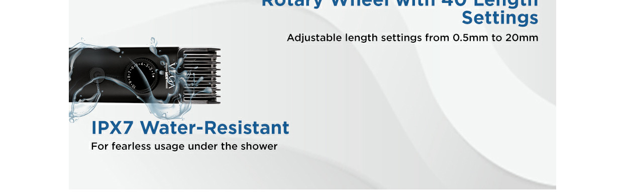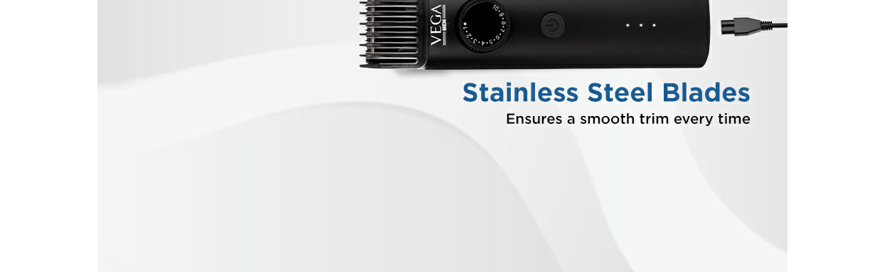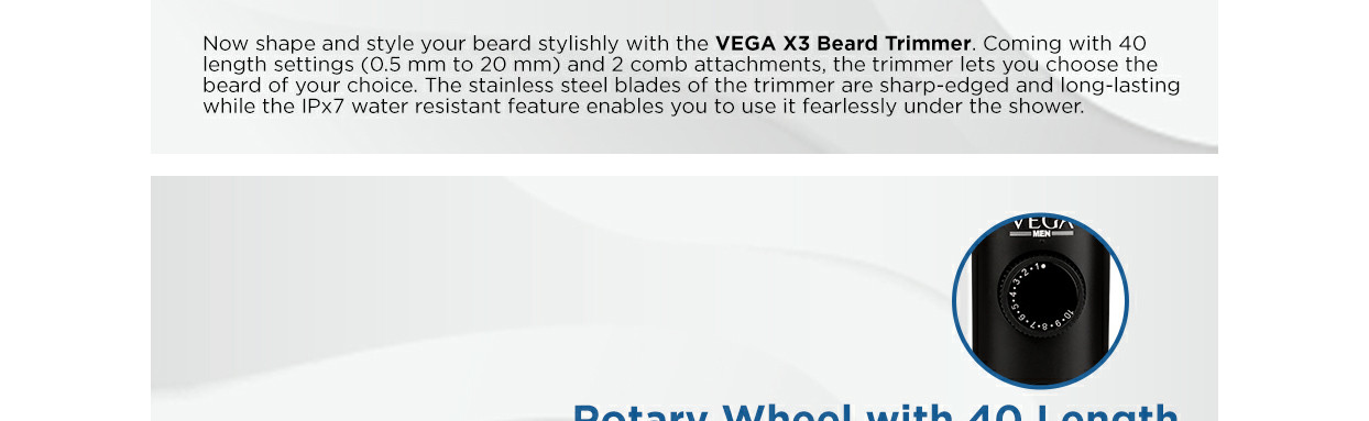VEGA Beard Trimmers are crafted with perfection for the man who settles for nothing but the best. With the 5-minute quick charge feature, you can use the trimmer for up to 10 minutes with ease when in a hurry. The revolutionary trimmer is designed for a one-pass trim from any angle and features 40 length settings from 0.5mm to 20mm to trim all your varied beard phases to the exact length you desire. Self-sharpening stainless-steel blades stay sharp and last long, give a smooth finish and combs are gentle on the skin. The trimmer is waterproof (IPX 7), and the body is fully washable and has a detachable head. Charge the trimmer by just plugging a USB cable onto a laptop, or power bank or using your adaptor (Adaptor excluded). Let your beard define you.