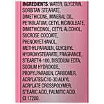 Water, Glycerin, Sorbitan Stearate, Dimethicone, Mineral Oil, Petrolatum, Cetyl Ricinoleate, Sucrose Cocoate, Dimethiconol, Cetyl Alcohol, Phenoxyethanol, Methylparaben, Glyceryl Hydroxystearate, Steareth-100, Disodium EDTA, Sodium Hydroxide, Fragrance, Acrylates/c10-30 Alkyl Acrylate Crosspolymer, Carbomer, Propylparaben, Palmitic Acid, Stearic Acid, Alpha-Iso Methyl Ionone, Benzyl Benzoate, Hexyl Cinnamal, Benzyl Salicylate, Hydroxycitronellal, Linalool, Limonene, Citronellol, Benzyl Alcohol, Ci 17200.
