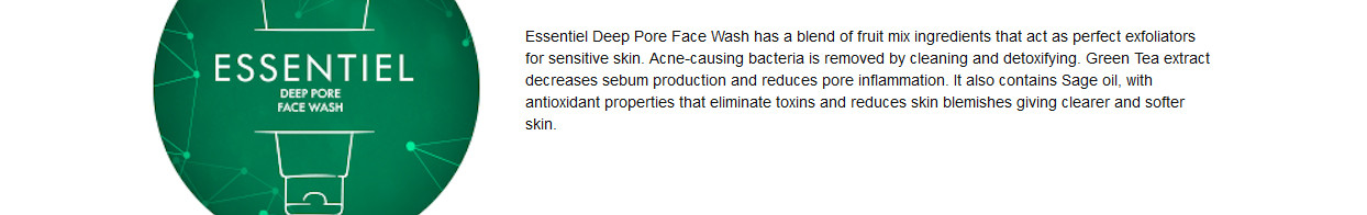 Essential Deep Pore Face Wash has a blend of fruit mix ingredients that act as perfect exfoliators for sensitive skin. Acne-causing bacteria are removed by cleaning and detoxifying. Green Tea extract decreases sebum production and reduces pore inflammation. It also contains Sage oil, with antioxidant properties that eliminate toxins and reduces skin blemishes giving clearer and softer skin. It detoxifies the skin, controls sebum production, and diminishes blemishes.
