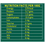 Nutrition_per: 100g Energy: 129 kcal Protein: 5.7 gms Sugars: 1.5 gms Carbohydrates: 25.3 gms Iron: 1 mg Total Fat: 0.5 gms Cholesterol: 0 mg MUFA: 0 mg PUFA: 0 mg SFA: 0 mg TFA: 0 mg