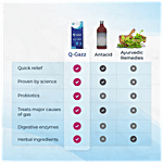 Q-gazz is used to treat digestive problems. It accelerates the digestion process and helps in the treatment of indigestion, gas and bloating. It has digestive enzymes that aid in the breakdown of complex food into simpler compounds and carminative oils, thereby aiding the digestion process altogether. The bacteria (B.coagulans) help improve the host's intestinal health and ward off infections.