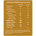 Nutrition per gram/ml: 100g Serving Size: 4.5g (5 FL) Energy (kcal): 898 Protein (g): 0 Carbohydrate (g): 0 Added Sugar (g): 0 Total Fat (g): 99.7 Saturated Fat (g): 66 Trans Fat (g): 4 Cholesterol (mg): 250 Omega-3 (mg): 400 Vitamin A (µg RE): 600 Vitamin D (µg): 5.5 ß-Carotene (µg): 736 Sodium (mg): 0