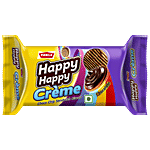 Appealing to both the eyes and the taste buds, Happy Happy Creme is a perfect treat for kids! With delicious chocolate cream sandwiched between two crunchy choco-chip cookies, Happy Happy makes for a perfect fusion of fun and indulgence! With its perfect taste beloved by kids with a sweet tooth, its easy to lose yourself in the inside cream or the outside crunch and impossible to stop after just one! Browse Parle's wide range of sweet and salty biscuits and cookies and much more, right here on Big Basket!