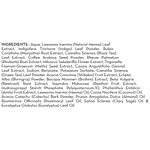 Aqua, Lawsonia Inermis (Natural Henna) Leaf Extract, Indigofera Tinctoria (Indigo) Leaf Powder, Rubia Cordifolia (Manjistha) Root Extract, Camellia Sinensis (Black Tea) Leaf Extract, Coffee Arabica Seed Powder, Rheum Palmatum (Rhubarb) Root Extract, Hibiscus Sabdariffa Flower Extract, Trigonella Foenum-Graecum (Methi) Seed Extract, Cassia Angustifolia (Senna) Leaf Extract, Sodium Benzoate, Potassium Sorbate, Camellia Sinensis (Green Tea) Leaf Powder, Acacia Concinna (Shikakai) Fruit Extract, Eclipta Alba (Bhringraj) Powder, Bacopa Monnieri (Brahmi) Extract, Beta Vulgaris (Beetroot) Root Extract, Sapindus Mukurossi (Reetha) Fruit Extract, Hydroxypropyl Starch Phosphate, Polyquaternium-10, Phyllanthus Emblica (Amla) Fruit Extract, Lawsonia Inermis (Henna) Oil, Cocos Nucifera (Coconut) Oil, Acacia Catechu (Catechu) Bark Powder, Prunus Amygdalus Dulcis (Almond) Oil, Rosmarinus Officinalis (Rosemary) Leaf Oil, Salvia Sclarea (Clary Sage) Oil & Eucalyptus Globulus (Eucalyptus) Leaf Oil