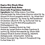 Pure Ghee (Clarified butter) 5g, Kokum Butter (Garcinia Indica) Sd. 2g, Almond Oil (Prunus Amygdalus Dulcis) Fr. 2g, Wheat Germ Oil (Triticum Vulgare) Fr. 2g, Honey 2g, Red Sandalwood Oil (Santalum album) Ht. Wd. 1g, Kumkumadi Taila 19, Preservatives: Euxyl PE 9010 (Phenoxyethanol & Ethylhexylglycerin) 1.6g, Excipients: Cetostearyl Alcohol 4g, Cetyl Alcohol 4g, Lecigel (Sodium Acrylates Copolymer & Lecithin) 3g, Glyceryl Monostearate 2g, Olivem-1000 (Cetearyl Olivate & Sorbitan Olivate) 2g, AQUAXYL (Xylitylglucoside - Anhydroxylitol - Xylitol) 2g Sodium Gluconate 0.4g, Vitamin E (Tocopherol) 0.4g, Purified Water Q.S.