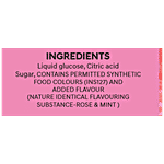 Liquid Glucose, Citric Acid, Sugar, Contains Permitted Synthetic Food Colours (INS127) And Added Flavour (Natural Identical Flavouring Substance - Rose & Mint)