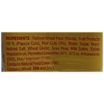 Refined Wheat Flour (Maida), Fruit Products 10% (Papaya Cuts), Peel Cuts (3%), Water, Sugar, Yeast, Iodized Salt, Soya Flour, Wheat Gluten, Edible Vegetable Oil, Milk Solids, Permitted Emulsifiers (471, 472e), Flour Improver (1100), Antioxidants (300). Contains Natural Food Colour (100). Contains Wheat, Milk & Soya.