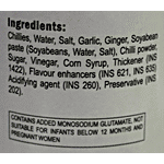 Chillies, Water, Salt, Garlic, Ginger, Soyabean Paste (Soyabeans Water, Salt), Chilli powder, Sugar, Vinegar, Corn Syrup, Thickener 1422), Flavour Enhancers (INS 621 INS 635) Acidifying Agent (INS 260), Preservative INS 202).