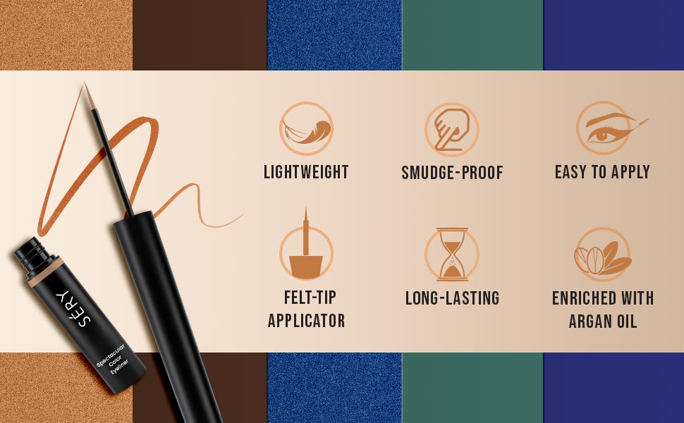 Presenting SERY Spectacular Color Eyeliner that offers all kinds of looks, be it classic look, winged look and everything in between. It comes with long-lasting power, easy application and great precision. SERY Liquid eyeliner is available in five different shades, catering to all your needs at one stop destination and are perfect to create an eye statement to unleash your inner artist. Its one stroke of application is packed with the goodness of Argon oil that beautifies and moisturises your eyes at the same time. This colour eyeliner comes with a felt tip applicator that makes it more comfortable to get sharp, crisp and defined lines in no time. Liquid liner application was never this enticing!