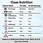 Nutrition per gram/ml: 100g Serving Size: 25g Total Energy: 402.8 Kcal Protein: 11.5g Total Carbohydrates: 70.7 g Dietary Fiber: 5.7g Sugar: 0g Added Sugar: 0g Total Fat: 8.2g Saturated Fat: 1.9g Sodium: 11.8 mg