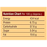 Nutrition per gram/ml: 100g Energy: 434 kcal Protein: 6.75 g Carbohydrate: 57.6 g Sugar: 5.04 g Fat: 19.6 g
