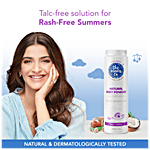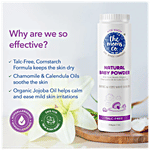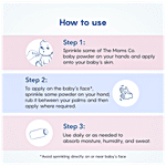 The Moms Co. Natural Baby Powder with Corn Starch, Organic Chamomile Oil, and Calendula Oil is a talc-free powder that absorbs moisture, soothes irritation, and keeps your baby's skin dry and comfortable.