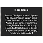 Beaten Chickpea (chana), Spices Mix (Black Pepper, Cumin seed, Clove, Asafoetida, Amla, Dry Mango Powder, Aniseed, Dry Ginger, Cinnamon, Laungi Mirch, Tartaric, Salt (rock, black, iodized)).