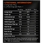 Nutrition_per: 100g Serving_Size: 70g Energy (kcal): 385 kcal Protein (g): 12.5 g Carbohydrate (g): 75.06 g Total Sugars (g): 1.47 g Added Sugars (g): 0.92 g Total Dietary Fiber (g): 10.13 g Total Fat (g): 1.6 g Saturated Fat (g): 0 g Trans Fat (g): 0 g Sodium (mg): 444 mg RDA: Recommended Dietary Allowance values calculated on the basis of 2000 kcal energy for an average adult per day.