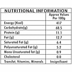 Nutrition per gram: 100g Energy (Kcal): 417 Kcal Carbohydrate: 68.5 g Protein: 11.1 g Fat: 12.7 g Saturated Fat: 6.4 g Polyunsaturated Fat: 5.2 g Mono Unsaturated fat: 0.9 g Cholesterol: 0.0 g