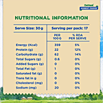 Nutrition per gram/ml: 100g Serving Size: 30g Energy (Kcal): 359 Protein (g): 22 Carbohydrate (g): 62 Total Sugars (g): 0.6 Added Sugars (g): 0 Total Fat (g): 1 Saturated fat (g): 0 Trans fat (g): 0 Cholesterol (mg): 0 Sodium (mg): 20