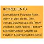 Nitrocellulose, Polyester Resin Acetyl tri butyl citrate, Ethyl Acetate, Butyl Acetate, Iso-Propyl Alcohol, n-Butyl Alcohol, Phenoxy Methanol Acetate, Acrylate Co-Polymer, Steary Iconium, Hectorite.